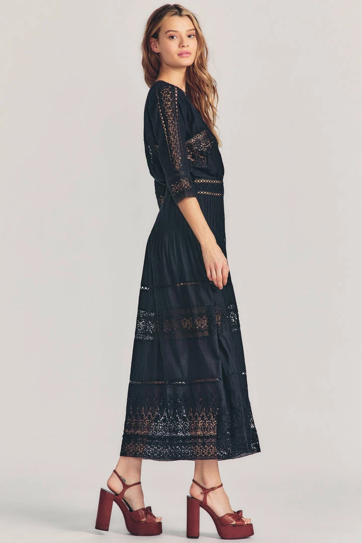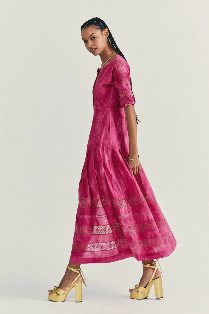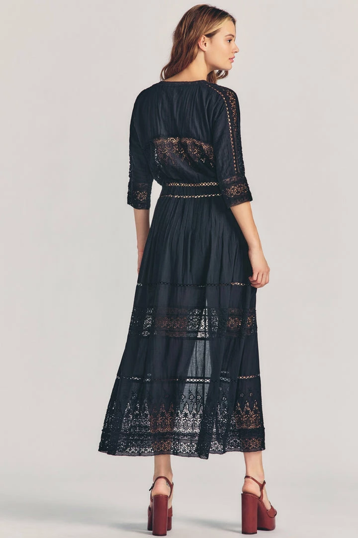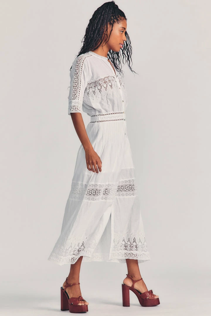 Our forever favorite Edie Dress is reimagined in airy hand-dyed cotton with elaborate panels of inset crocheted lace. This relaxed dress is perfect as a beach coverup or party dress. This dress features a crewneck, mother-of-pearl buttons descending at center front, cuffed elbow sleeves, and an easy flowing maxi-skirt. Comes with a half-slip. Accessorize your Beth Dress with our LoveShackFancy x Lova The Flower Gold Earrings.Â