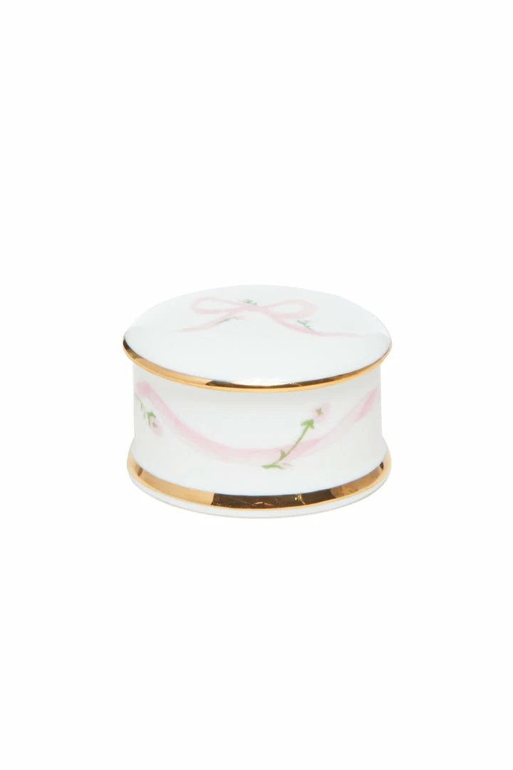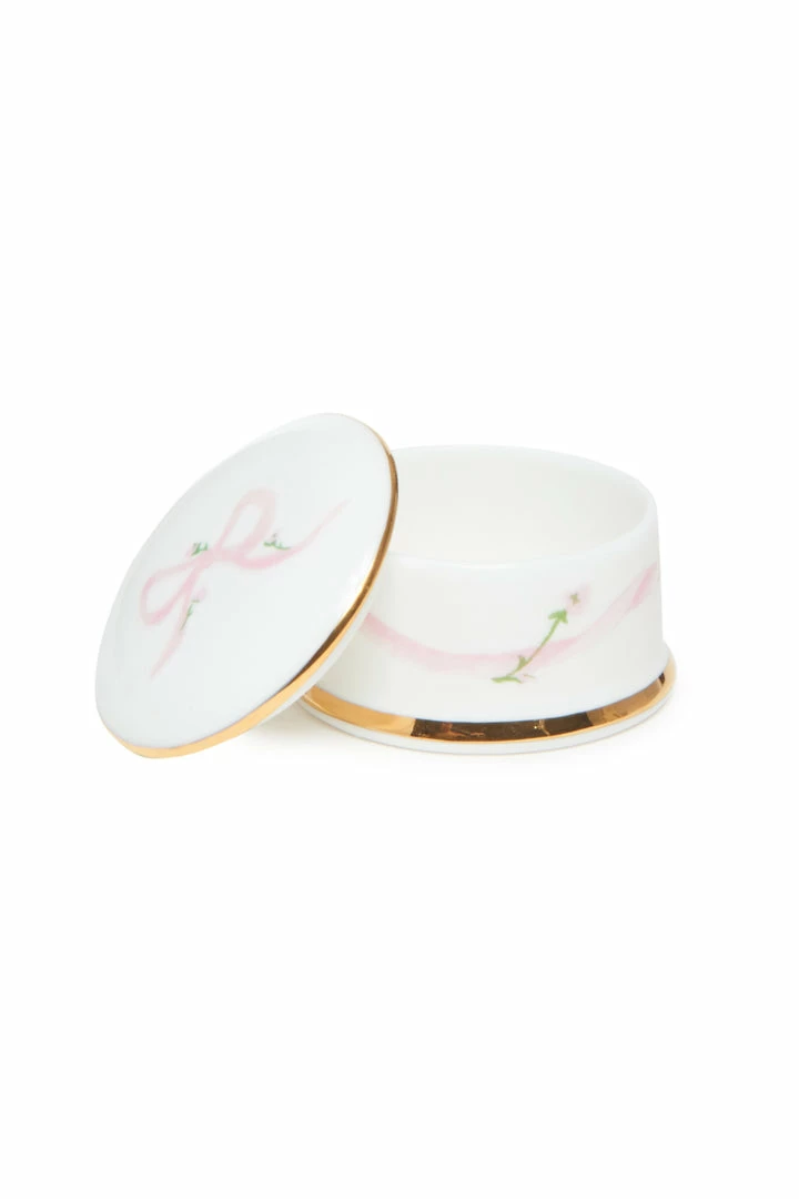 Cute as can be, this handmade porcelain small round box makes the perfect home for trinkets and treasures. Made in the English Countryside by The Present Company. Shown here in Pink Bow.