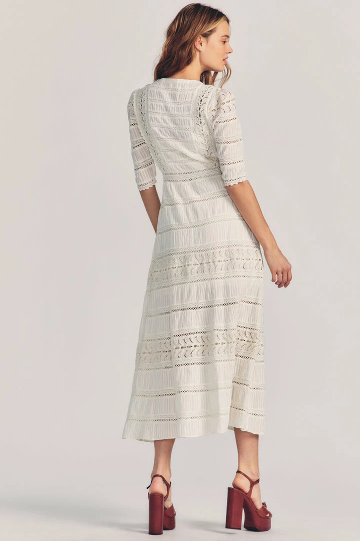 Our Flora dress is a forever favorite in Balearic lace. This dress is intricate and elegant with mother of pearl buttons down the length of the body. The sleeve is slightly shirred at the shoulder and finished with a darling ruffle at the elbow-length hem. The maxi length skirt features alternating strips of pin-tucked cotton, schiffli embroidered eyelet, and custom inset lace trims. The inset lace waistband is flat at the front with elastic at the back for ease of wear. Accessorize your Flora Dress with our LoveShackFancy x Lova Gold Heart Beige Lace Fringe Earrings.Â