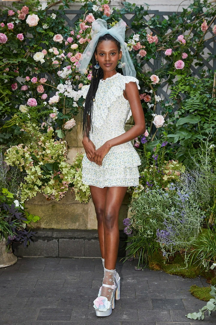 Our Lunetta Dress is new in a mix of custom lace and eyelet fabrics with a ditsy rosebud print and bobble trim. This sweet minidress has a ruffled collar surrounded by a v-shaped yoke with functional buttons and a scalloped lace border that forms flutter sleeves. The body is fitted to a dropped waist, where it flares to tiered flounces in alternating fabrics. Shown here in White Garden Stream. Pair your mini dress with our Lune Crop Pullover.