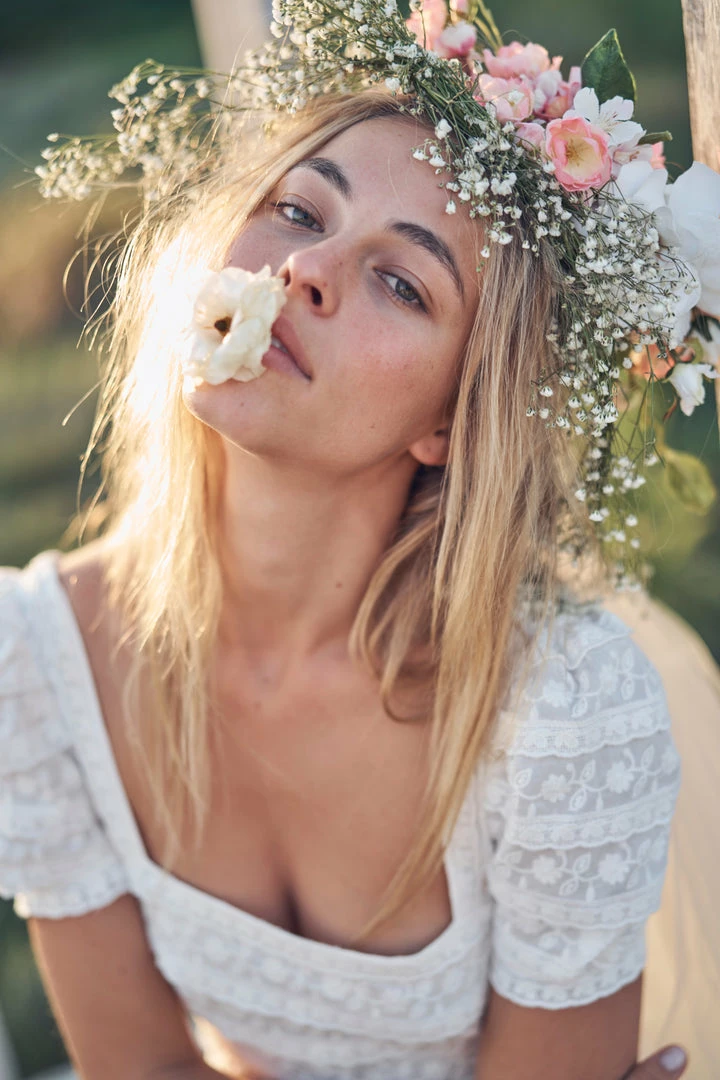 Our Ryan Dress in Catalina Lace is romantic and playful, designed with alternating rows of embroidered floral motifs and scalloped lace trim. This forever favorite features a square lace neckline with a fitted bodice and short puff sleeves. Elegant at all angles, the high waisted skirt opens up with full sweeping drama. Removable slip included. Accessorize your Ryan Dress with our LoveShackFancy x Lova Palm Tree Earrings. Shown here in Ivory.