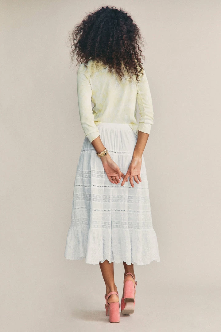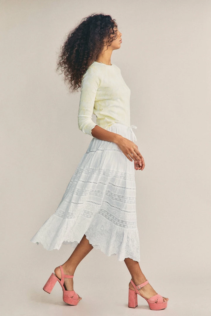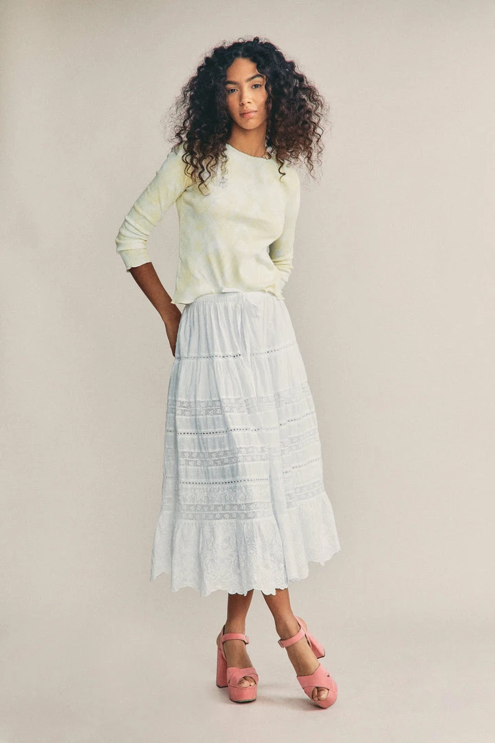 Our new Donna Skirt sashays in with inset floral lace and lofty wildflower embroidery on custom dobby cotton. A functional drawcord at the waist can be tied in a bow at front or back. Below, the full sweep, midi-skirt drops into shirred panels and a final embroidered flounce at bottom. Pair it with our Lune Crop Pullover. Shown here in Antique White.