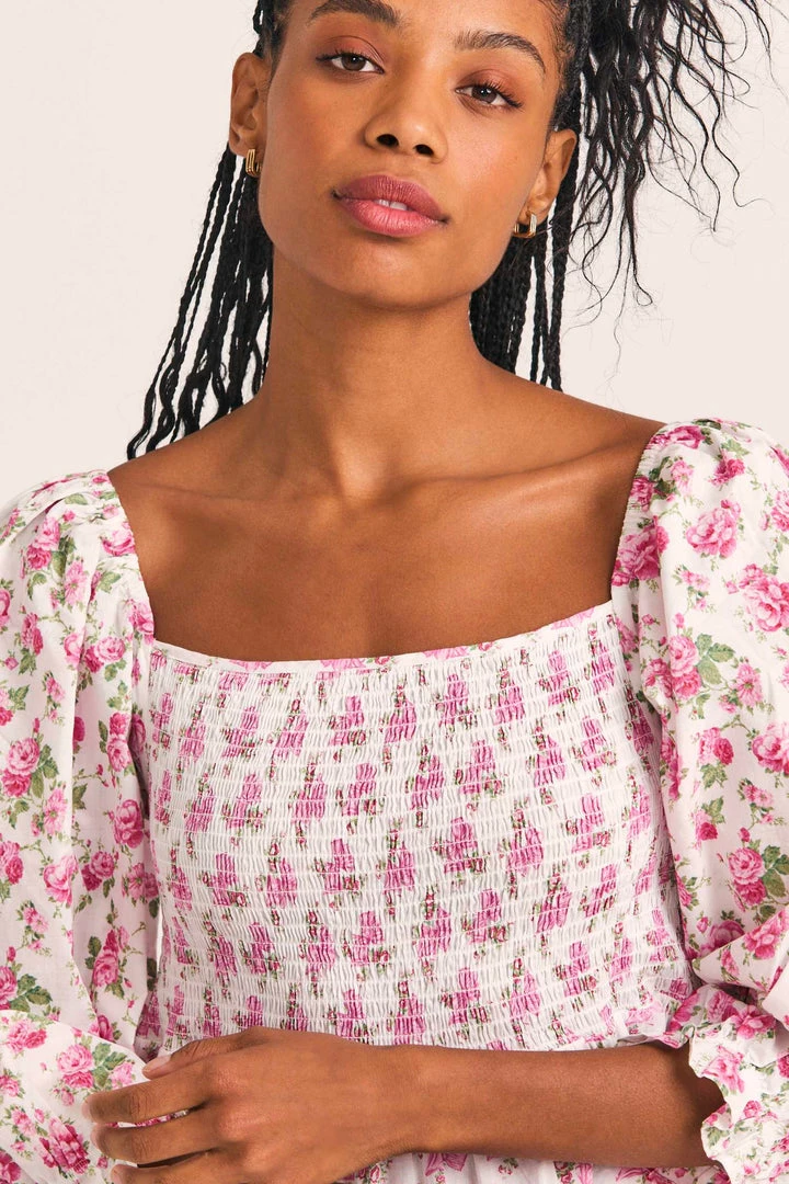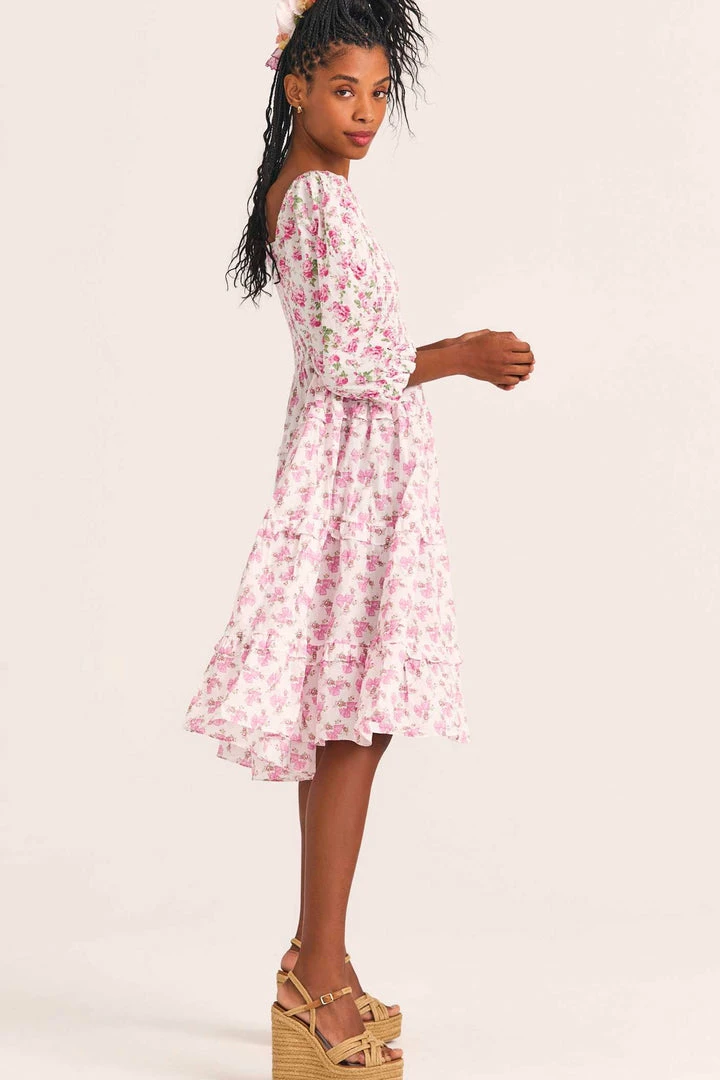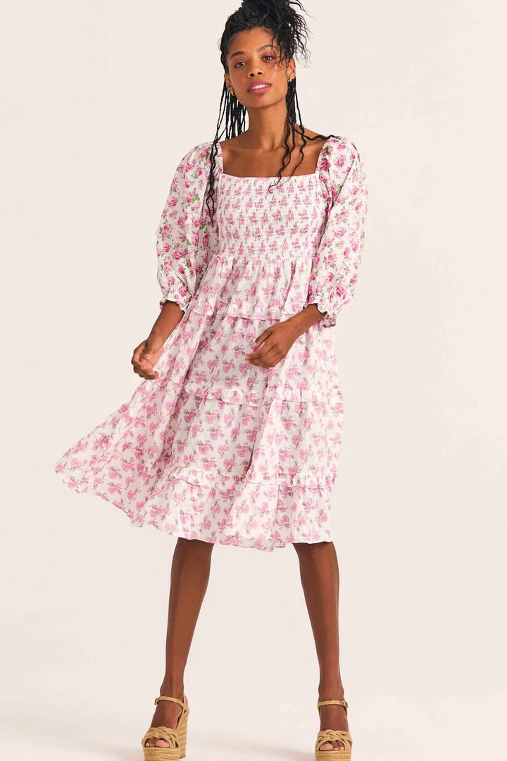 Meet the Capri Dress, the loveliest midi dress adorned with pink, hand-painted roses. Puffed quarter sleeves and ruffled skirt complete the piece. Shown here in Playful Pink.