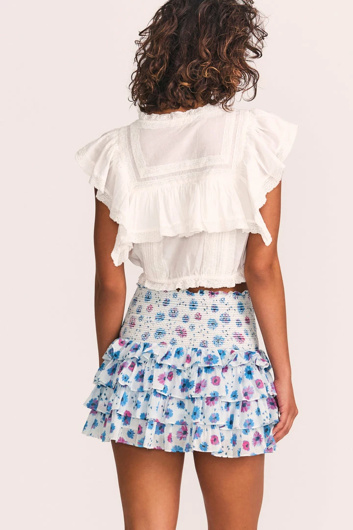 Our Yorkie Skirt is a yes in 100% cotton with a tossed daisy print. This easy everyday fit-and-flare miniskirt has a smoked top panel above four shirred flounces. Wear this with our Nora Top. Shown here in Deep Cotton Candy.