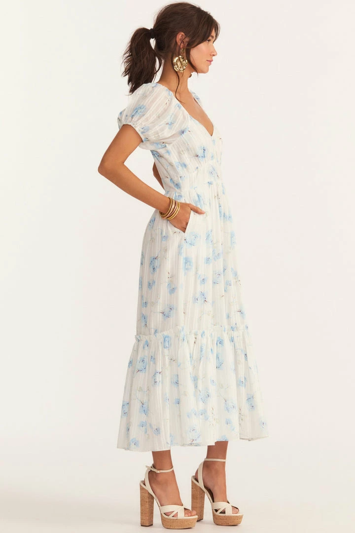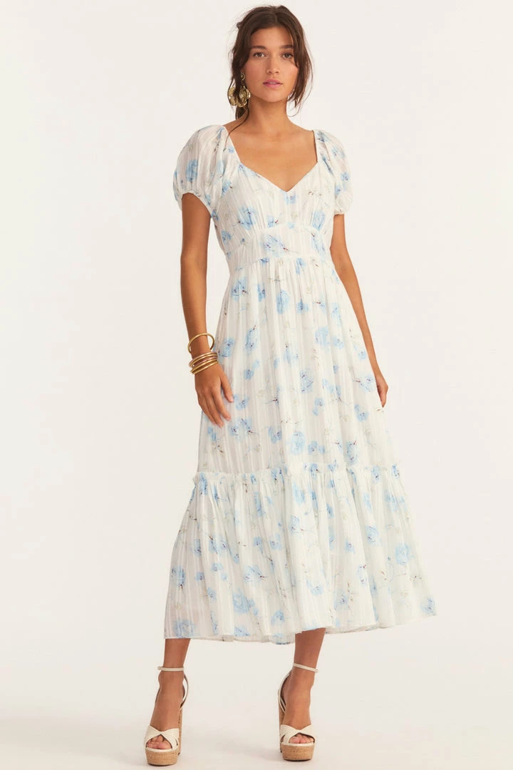 This season, our fan-favorite Angie dress is updated in viscose fabric. This vintage silhouette has a shirred bust and pert puffed sleeves with slits. The full skirt features a single shirred seam above an elongated flounce. Pair this with our LoveShackFancy x Lova The Flower Gold Earrings. Shown here in Santa Rosa River.