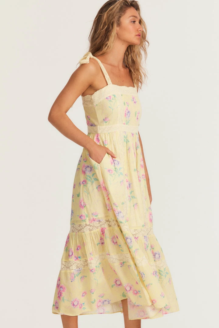 A new addition to our beloved Heritage Collection, the Ayala Dress steps onto the scene in a bright all-over sunflower floral. Our Victorian-inspired frock features custom, crocheted laces lined throughout. This intricate cotton voile frock has lace-covered straps connected to the lace-trimmed square neckline and bodice leading to an empire waist. The full sweep skirt falls to an array of detainling. Accessorize it with our Merle Bow Heels. Shown here in Bright Azalea.