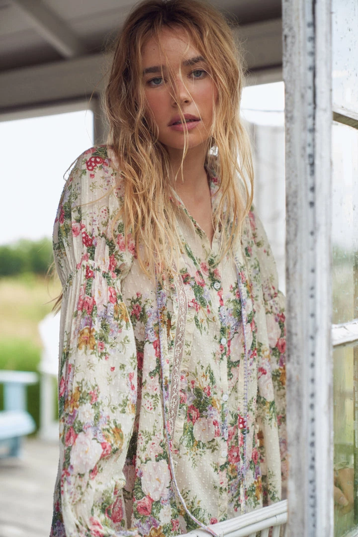 Our Fria Dress arrives in 100% cotton in our hero print of the season; a French textile-inspired floral Victorian, a favorite of our Creative Director’s Rebecca Hessel Cohen. This easy, transitional frock features intricate custom lace detail at the hem, removable belt, functional self binding that creates a tie at the front neck drop, a center front placket, a relaxed shape with full sweep, elastic at the sleeves, and side seam pockets. Accessorize this dress with tights and boots for a summer-to-fall look. Accessorize it with our Cornwall Fields Srunchies. Shown here in Shining Gemstone.
