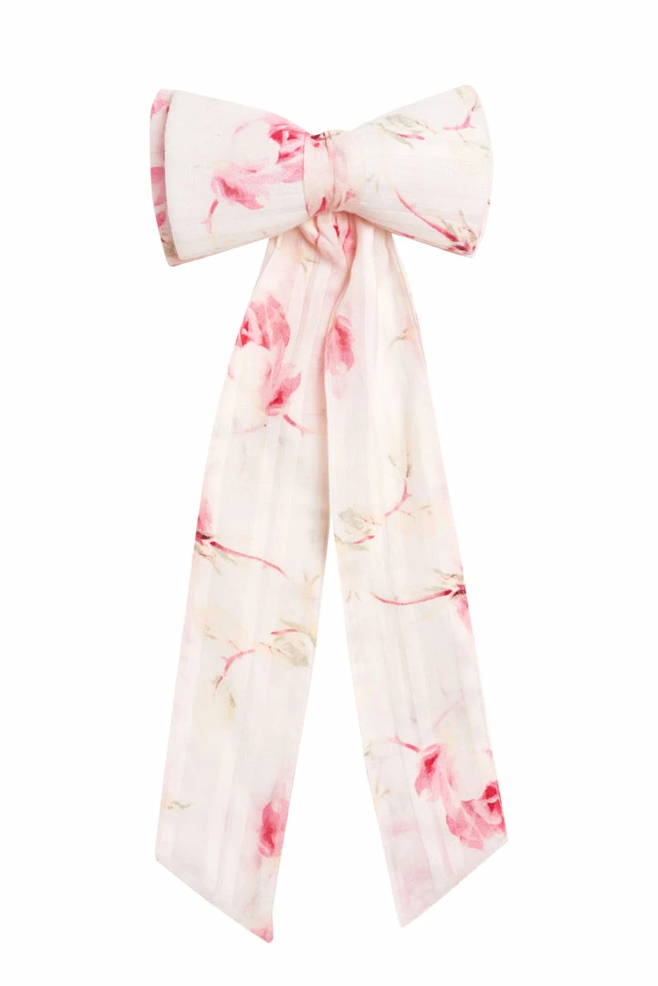 Our Lorna Barrette adds a girlish twist in silky viscose with a hand-painted print and a gold clip. This classic barrette features a smaller bow layered atop a larger one with diagonally cut ribbon peeking from beneath. Shown here in Cherry Soda.
