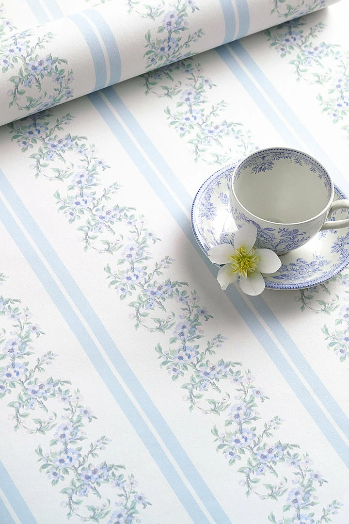 Dress up your walls in this timeless floral stripe wallpaper. Winding, hand-painted vines and delicate blooms are framed by blue-colored stripes and set against antique white. Mix and match with our Marigold Wreath Quilt & Sham Set. Shown here in Baby Blue Rush.