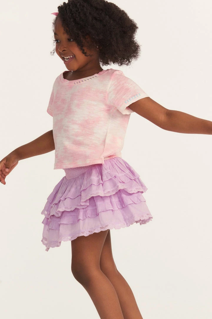 Our beloved Billie Skirt is reimagined in 100% cotton. Below a wide smocked waistband, the skirt falls to two shirred tiers with ruffle details. Pair it with our Girls Mini Rubin Tee. Shown here in Wisteria.