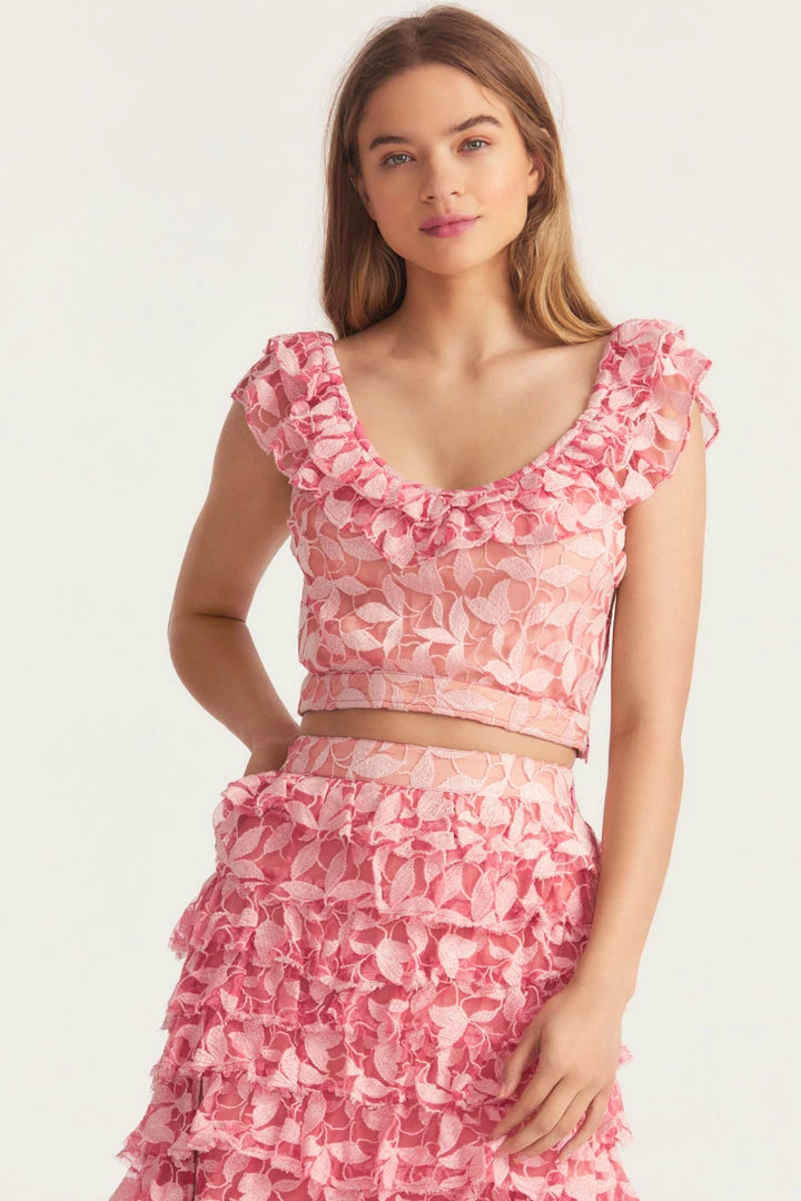 Pretty in pink in our Sarafina Crop Top with lovely custom petal lace adorned throughout with pretty seam details. This feminine top makes for the perfect day to night piece. Shown here in Watermelon Punch.