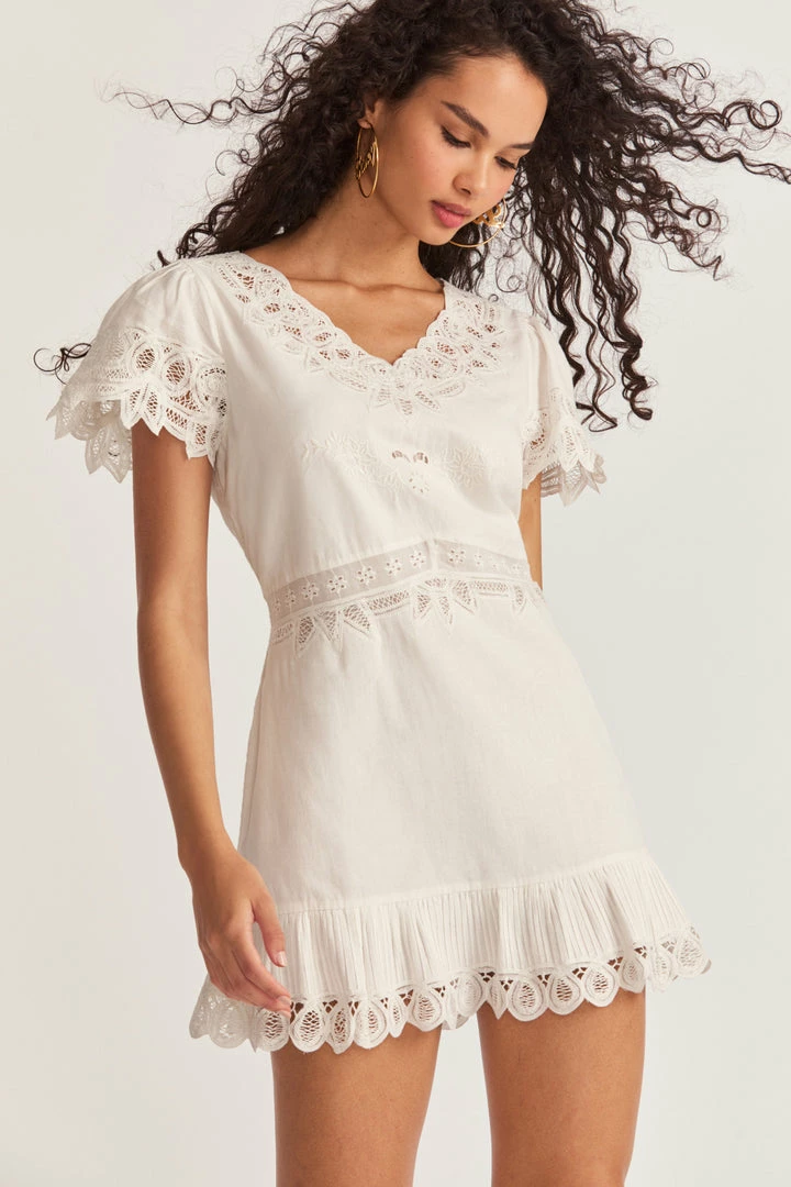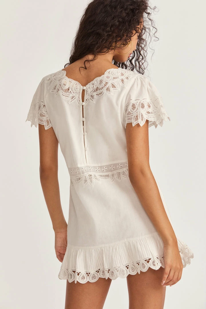Cute as can be in our new Thara Dress. Designed with a new, easy fabrication with custom battenburg lace. Flutter sleeves and the neckline are trimmed with intricate, eyelet embroidery with lace detailing at the bodice. With a relaxed fit, this frock features a keyhole with functioning buttons down the back, an eyelet trimmed hem and comes with a separate slip. Accessorize it with our LSF x Lova Dolce Vita Heart Flower Earrings. Shown here in True White.
