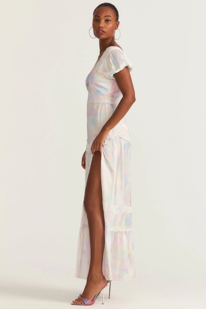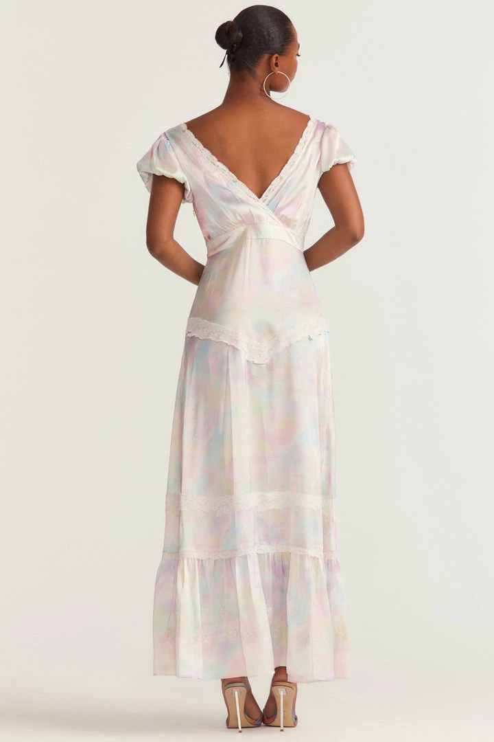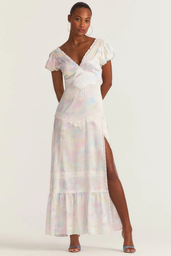 Having a moment in our Quintessa Dress. This maxi dress is fit for a princess in our fairytale, tie-dyed print with top-applied custom laces with floral embroidery, a deep v-neckline, lace insets and a slit on the wearer’s left side. Accessorize it with our LSF x Lova Gold Flower Earrings. Shown here in Fairytale Tie Dye.