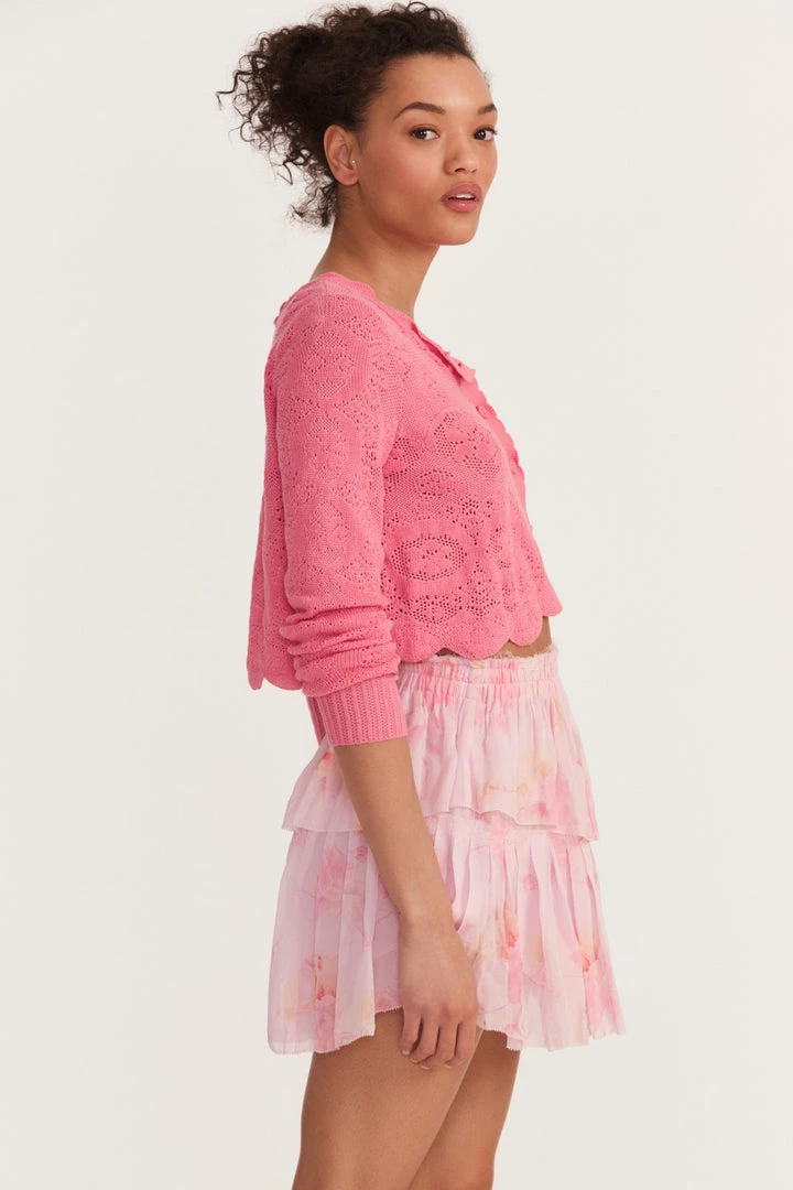Our signature Ruffle Mini is back in a viscose fabric with a vibrant, bayside print. The two-tiered short skirt with an elasticated waistband and shirred flounces, dances along with you as you move throughout the world. Pair it with our Muriel Crop Cardigan. Shown here in Summer Morning.