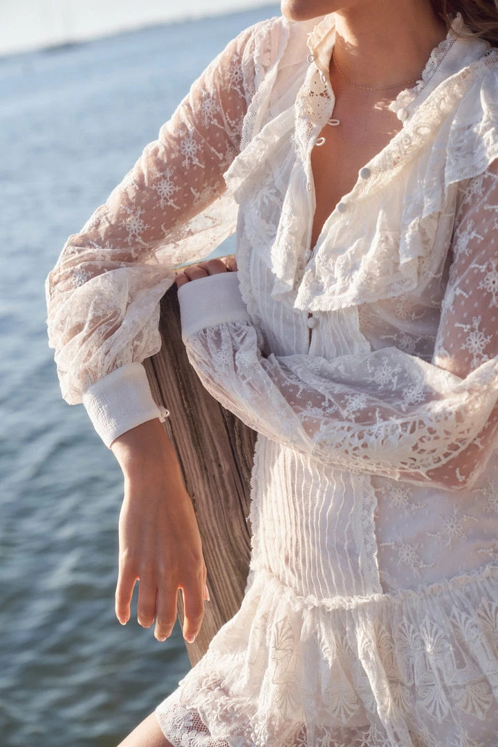 A vision in white, our Trisha Dress is ethereal. An elevated Victorian occasion piece, this whimsical garment features delicate design and detail throughout by mixing an elegant embroidered mesh with tucking mesh adorned in intricate custom edge lace stitch detailing. The darling collar is high in detail with functional center-front buttons, falling to a fixed waist. Airy blossom sleeves include functional cuffs. Romance found with a playful front to back finish. Pair it with our LSF x Lova Heart Flower Earrings. Shown here in True White.