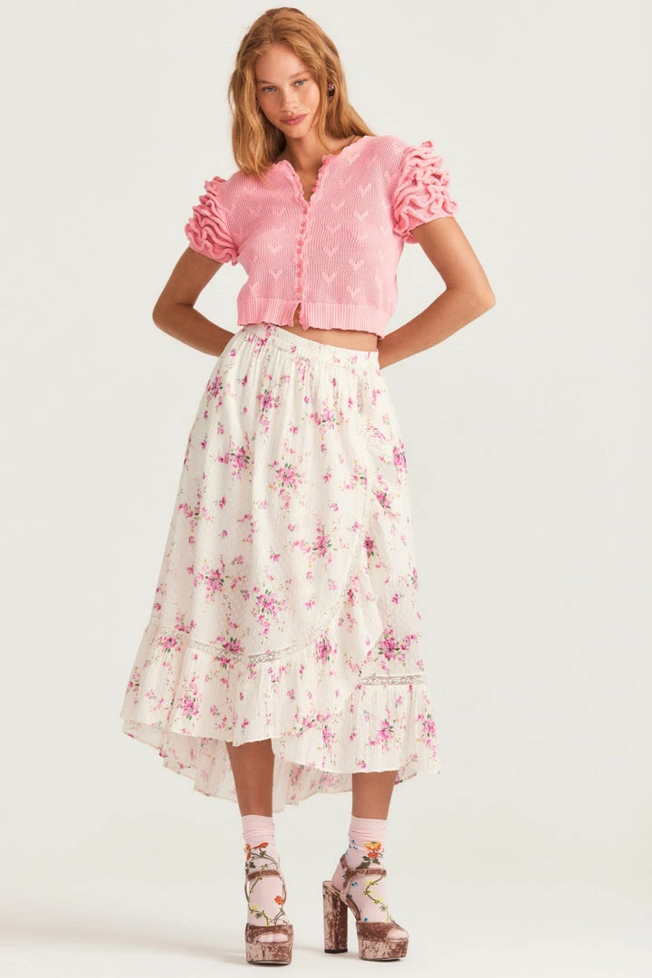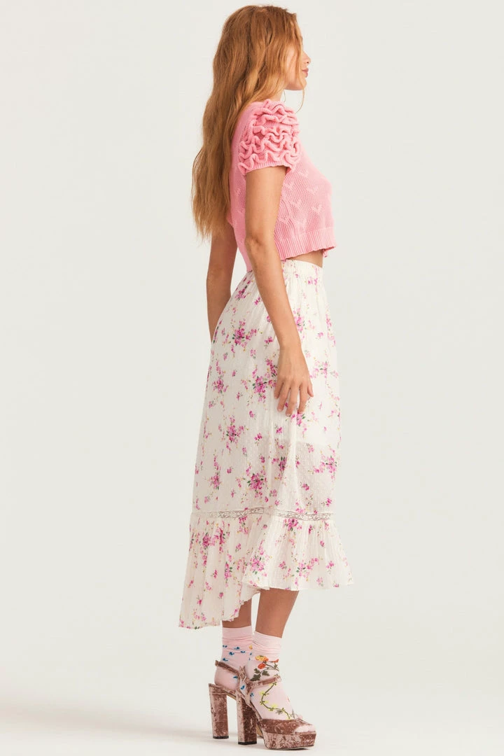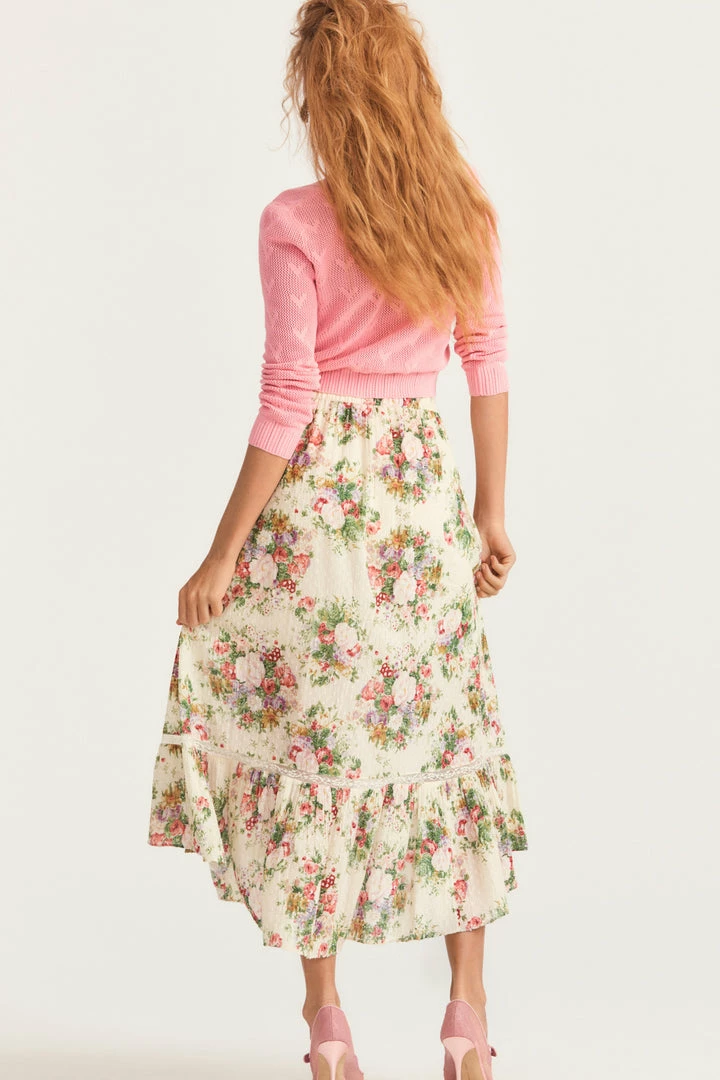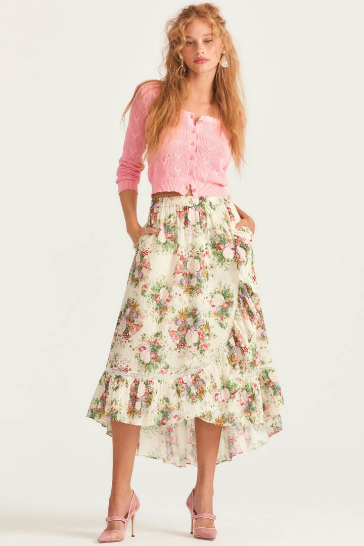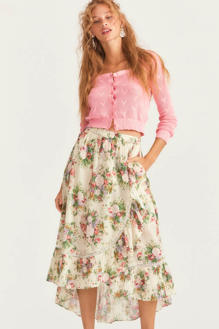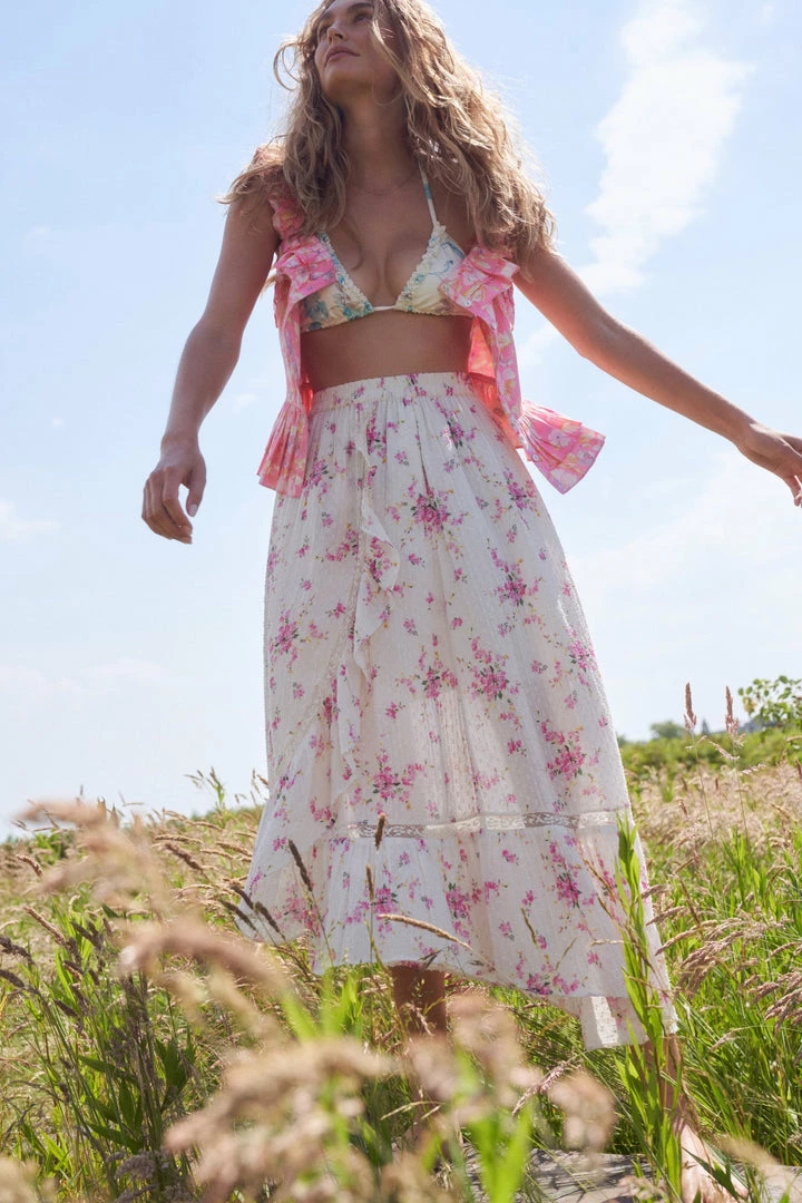 Debuting as the must-have summer-to-fall transitional skirt, the Viva Skirt is lovely as can be in our hero print of the season; a French-textile inspired floral Victorian, a favorite of our Creative Director’s Rebecca Hessel Cohen. This faux wrap midi steps on the scene in 100% cotton featuring intricate custom lace inset detailing, a full shirred flounce, encased elastic at the waist, and a slight high to low finish. Pair it with our Drea Crop Top or Preilla Crop Cardigan.Â