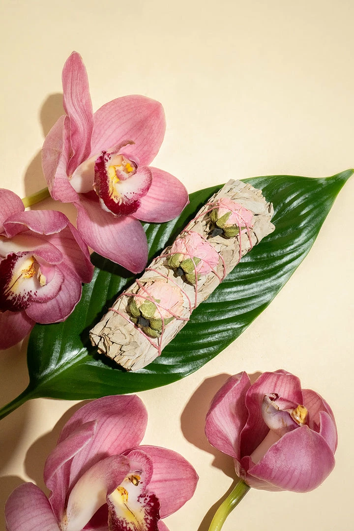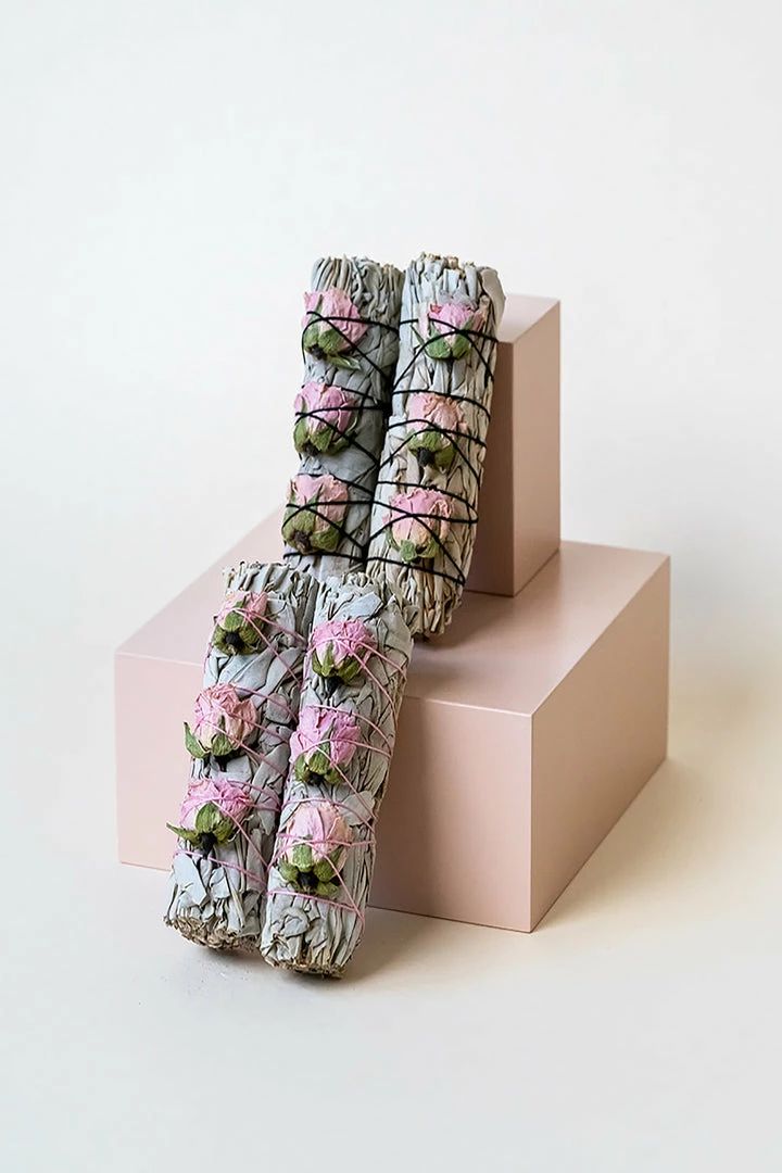 Good vibes only with the Blue Sage + Rose Smudge Stick from Black + Jane. Handpicked roses and white sage, wrapped in a vintage velvet ribbon with love. Shown here in Pink.